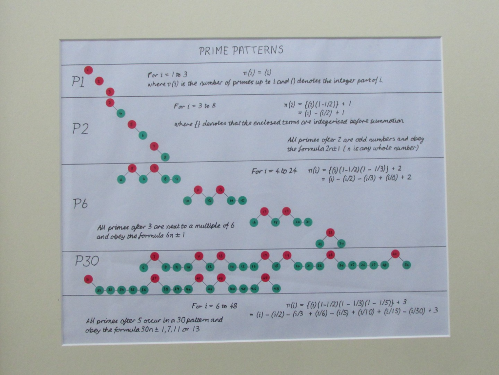 It shows some of the patterns exhibited by prime numbers and the mathematical equations that describe them.
